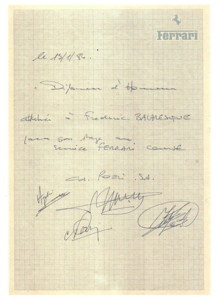 Il reçoit une formation exceptionnelle chez l’importateur Charles Pozzi à Paris, puis à l’usine Ferrari, Via Trento e Trieste à Modena au service technique sous la houlette de Signore Fiorini (Directeur technique compétition clients) jusqu’en 1986, où il participe au reconditionnement à neuf d’une des 288 GTO d’expérimentation.